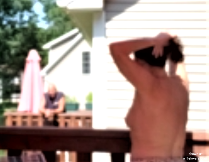 She never wears a suit and neighbor always comes out to do yard work when she is in pool!